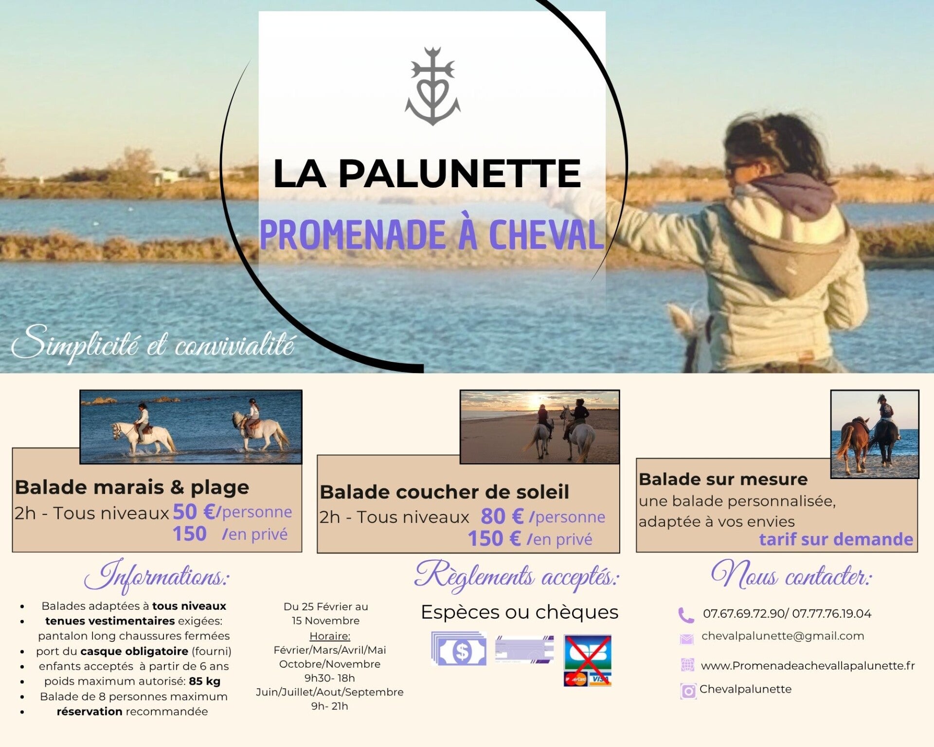 A la Promenade à cheval La Palunette, le bien-être de nos chevaux est notre priorité absolue. Tous nos chevaux sont bien dans leur tête et adaptés à tous les niveaux de cavaliers. Pour assurer leur confort et leur sécurité, le poids maximum autorisé pour nos cavaliers est de 85 kg. Nous proposons des balades en petits groupes ou en privé, à la plage ou dans les terres, toujours en toute sécurité. N'hésitez pas à nous contacter pour toute demande spécifique.